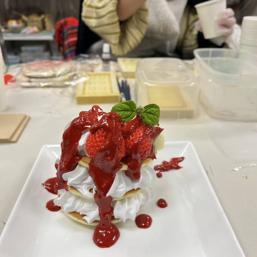 生徒さんが自分で考えて「魅せるデザインのパンケーキ」を作るのですが、食品サンプルを作る時、「魅せるデザイン」にするにはいくつかのルールがあるんです。