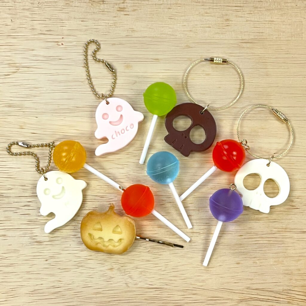 おばけチョコ、ガイコツチョコ、かぼちゃクッキー、キャンディ、好きなお菓子を組み合わせてチャームが作れます。
